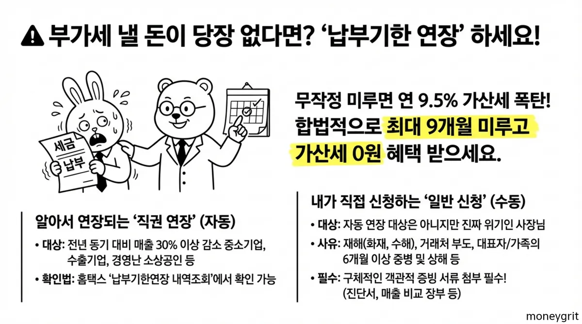 | 부가가치세 납부기한 연장 기간 | 최초 3개월, 최장 9개월 | 관할 세무서장 승인 필요 |