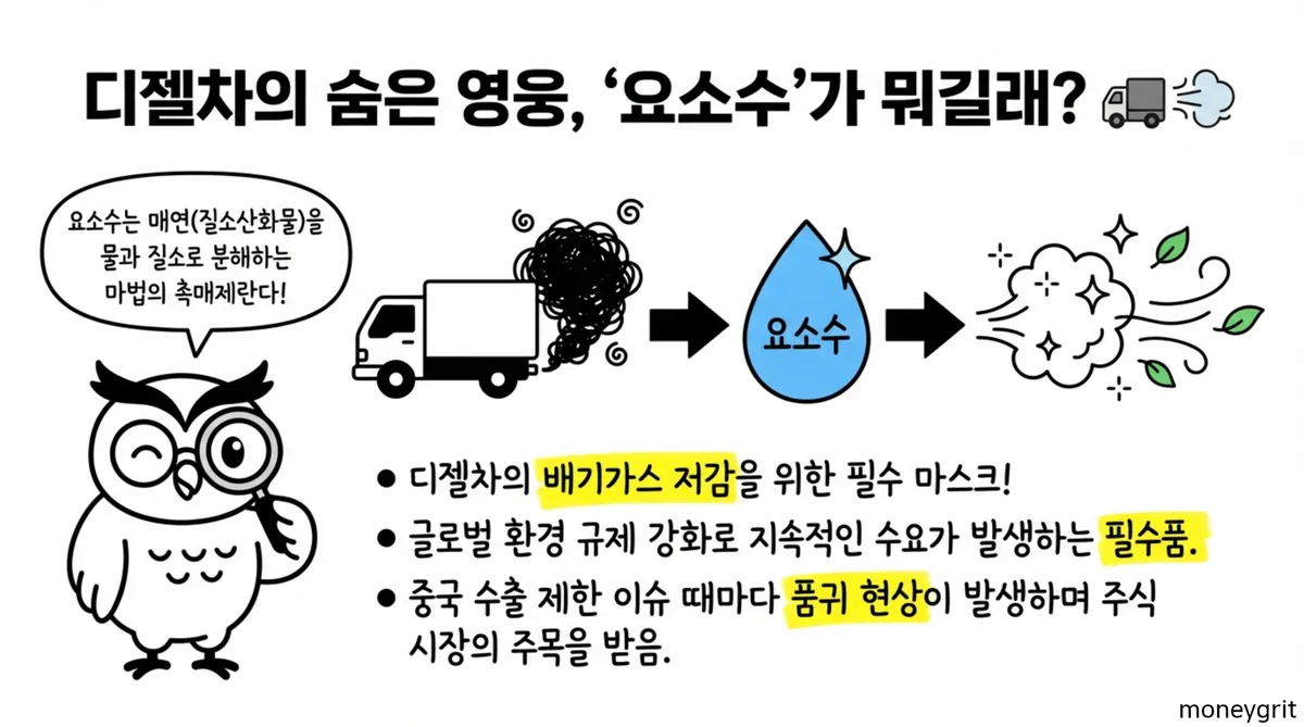요소수는 디젤 차량 배기가스에 포함된 질소산화물을 분해하는 필수적인 소모품이다. 전기차 전환이 가속화되고 있음에도 불구하고 대형 상용차 시장에서 요소수 수요는 여전히 견고하게 유지되고 있다. 요소수 관련주 시장의 가장 큰 특징은 중국이라는 특정 국가에 대한 수입 의존도가 매우 높다는 점이다.
