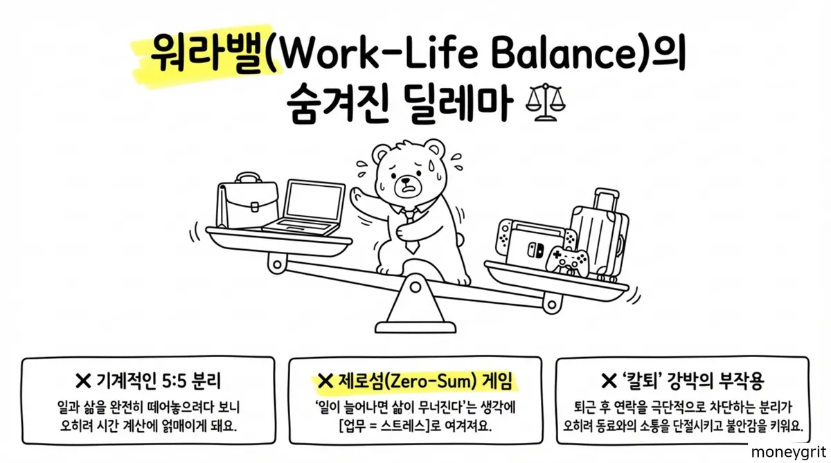 과거 노동 시장의 중심이었던 워라밸은 일과 삶을 5대 5로 엄격하게 분리하려는 시도에서 시작했다. 하지만 이는 일과 삶을 대립 관계로 규정하는 제로섬 게임의 한계를 드러내며 직원의 인지적 부조화를 유발하기도 했다.