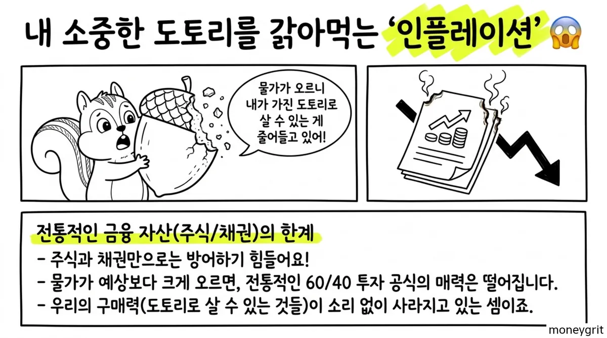 물가가 시장의 예측 범위 내에 있을 때는 주식과 채권이 제 기능을 하지만 예상을 뛰어넘는 인플레이션 상황에서는 할인율이 급등한다. 이때 실물 자산은 기대치가 즉시 가격에 반영되어 전통 자산의 가격 폭락 위험을 효과적으로 보완해 주는 역할을 수행한다.