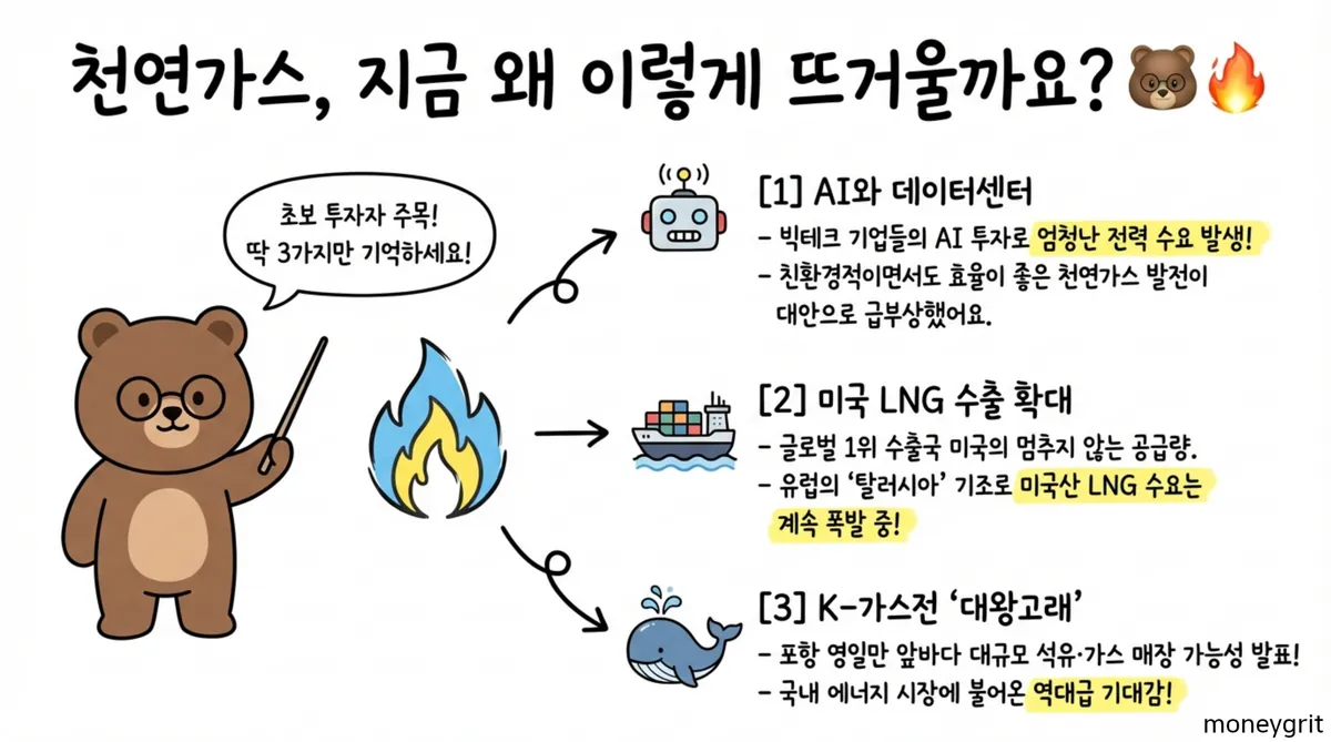최근 AI 산업의 급격한 팽창과 데이터센터 수요 폭증은 전력 부족 문제를 야기했고 이 과정에서 안정적인 에너지원인 천연가스의 가치가 재평가받고 있다. 과거의 단순한 화석 연료 프레임을 벗어나 에너지 전환의 가교 역할을 수행하는 천연가스 관련주 전반을 살펴본다.