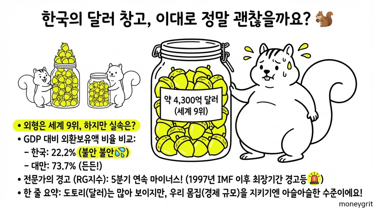 세종대 연구팀은 외환보유액 비율을 GDP로 나눈 RG지수가 5분기 연속 마이너스를 기록했다는 점을 지적했다. 특히 심리적 마지노선으로 여겨지는 4,000억 달러 선이 붕괴되면서 과거 외환위기 재현 가능성을 우려하는 목소리도 나온다.