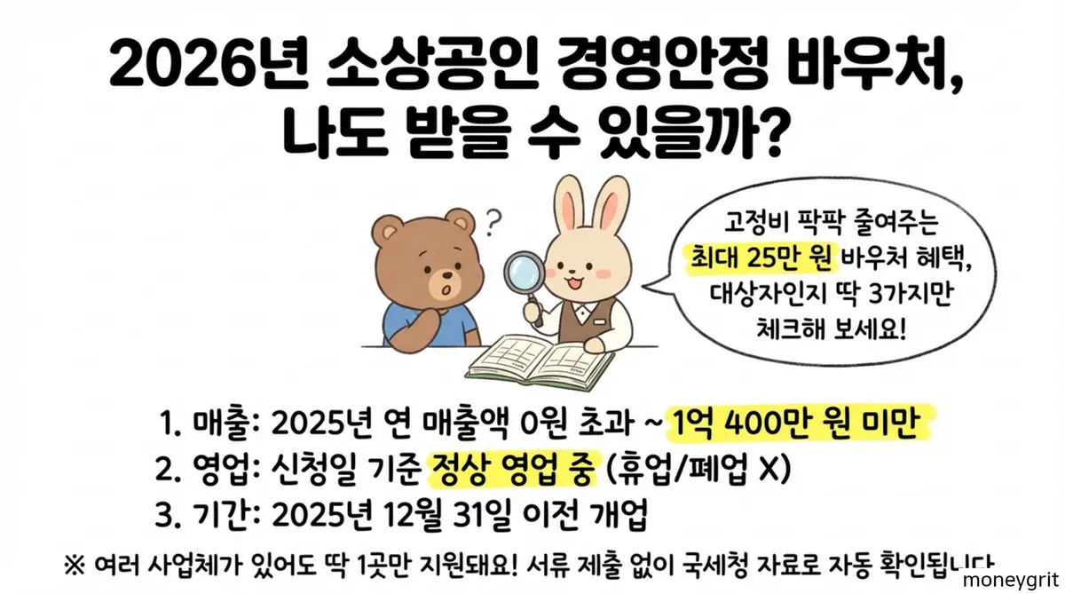 소상공인 경영안정 바우처 제도는 영세 사업자들이 필수적으로 지출해야 하는 공과금과 보험료 부담을 실질적으로 덜어주는 유용한 정책이다. 매출 기준이 낮아진 만큼 자신이 대상자에 해당한다면 공고를 꼼꼼히 확인하여 2월 초에 즉시 신청하는 것이 좋다. 이번 정책이 경영 위기를 극복하는 작은 발판이 되기를 바란다.