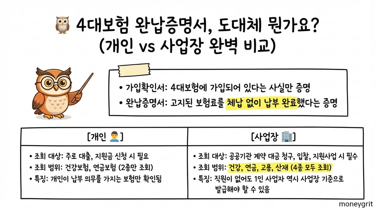 4대보험 완납증명서는 발급일 현재를 기준으로 국민연금, 건강보험, 고용보험, 산재보험료를 연체 없이 납부했음을 보여주는 공식 문서이다. 납부한 금액의 상세 내역을 보여주는 보험료 납부확인서와는 서류의 성격과 용도가 명확하게 다르다. 미납이나 연체된 금액이 전혀 없음을 대외적으로 입증하는 것이 4대보험 완납증명서 핵심 기능이다.
